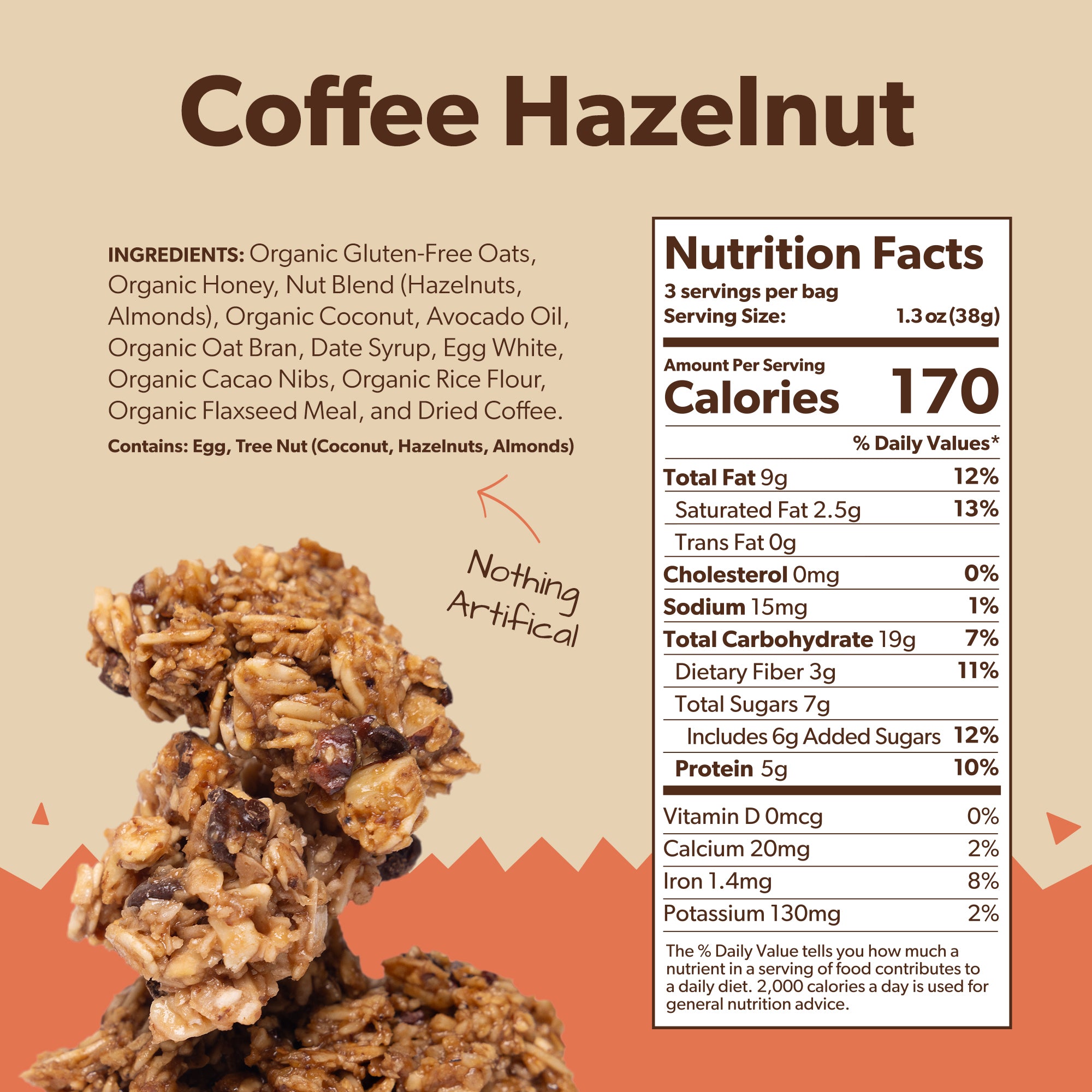 Each serving has 5g Protein, 3g Fiber and no highly processed ingredients. 3 Serving per bag. Gluten-free, dairy-free, soy-free, seed oil-free, refined sugar-free, and loved by the whole family!